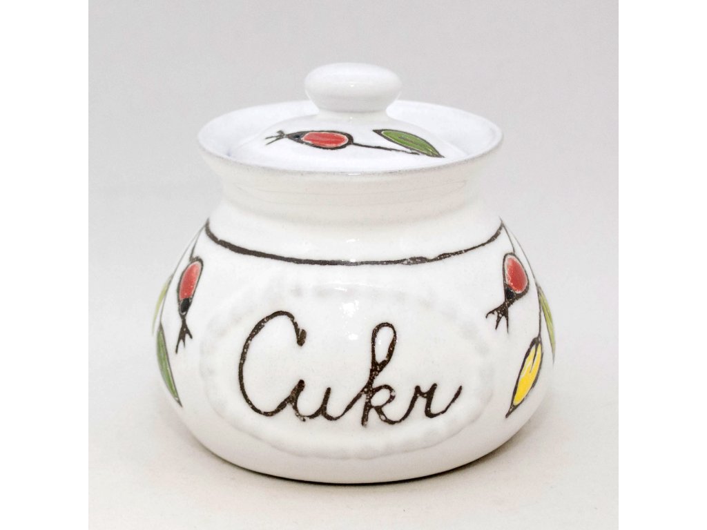 Každá naše cukřenka je trošičku originál, protože se jedná o ruční výrobek. Než si do ní cukr, vezme ji do rukou mnoho lidí. Nejprve ji nalijeme do formy a necháme ji zaschnout tak, aby její stěny měly požadovanou šířku. Pak ji opatrně vyjmeme a obrousíme nedokonalosti. Po uschnutí čeká cukřenku první výpal v keramické peci a poté přijde řada na glazuru a dekor. Obrázky na misku si buď předmalováváme voskem (to jsou ty obrázky s viditelnou konturou) nebo je malujeme barvítky přímo na glazuru (drobné vzorky kytiček nebo puntíků). A teprve potom ji čeká ostrý výpal v keramické peci.