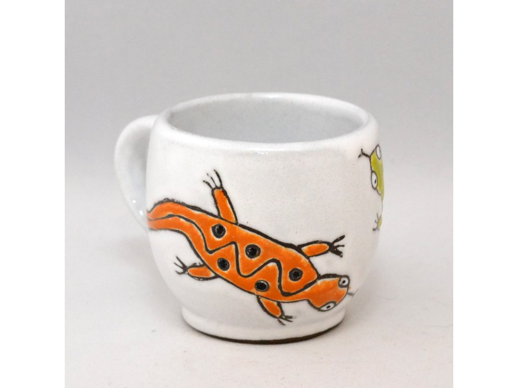Každý náš hrnek je trošičku originál, protože se jedná o ruční výrobek. Než si do něj nalejete svou kávu, vezme jej do rukou mnoho lidí. Nejprve jej nalijeme do formy a necháme ho zaschnout tak, aby jeho stěny měly požadovanou šířku. Pak jej opatrně vyjmeme a obrousíme nedokonalosti. Po uschnutí čeká hrnek první výpal v keramické peci a poté přijde řada na glazuru a dekor. Obrázky na hrnky si buď předmalováváme voskem (to jsou ty obrázky s viditelnou konturou) nebo je malujeme barvítky přímo na glazuru (drobné vzorky kytiček nebo puntíků). A teprve potom čeká hrnek ostrý výpal v keramické peci.