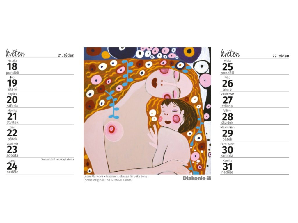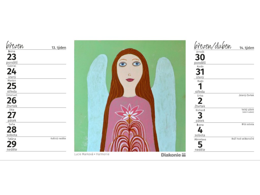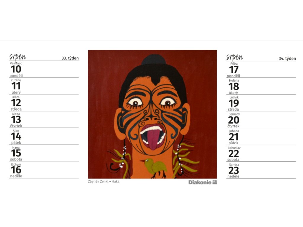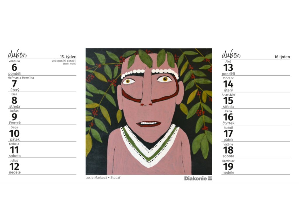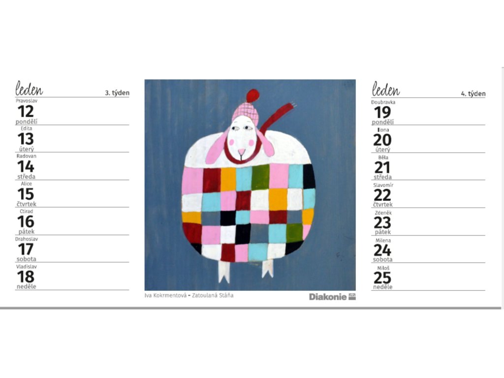 Novinkou letošní sezóny je stolní kalendář se čtrnáctidenním kalendáriem. Dvanáct obrazů od lucie Markové z nástěnného kalendáře jsme doplnili o 16 starších obrazů z Rolničky nejen od Lucie, ale také od Ivy Kokrmentové a Zbyňka Zenkla. Všichni jsou zaměstnanci naší chráněné dílny. Kalendář vám poskytne dostatek místa pro záznam vašich schůzek a důležitých událostí.