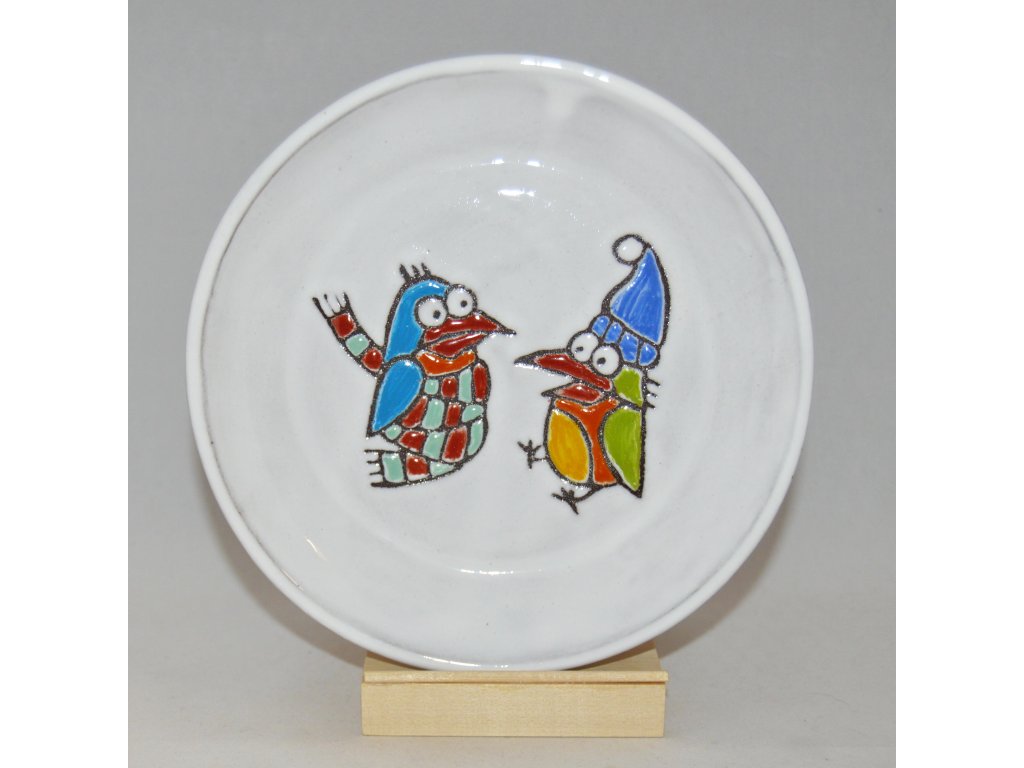 Každý náš talířek je trošičku originál, protože se jedná o ruční výrobek. Než si na něj postavíte svůj oblíbený hrnek nebo na něj své návštěvě nabídnete dezert, vezme jej do rukou mnoho lidí. Nejprve jej nalijeme do formy a necháme ho zaschnout tak, aby měl požadovanou šířku. Pak jej opatrně vyjmeme a obrousíme nedokonalosti. Po uschnutí čeká talířek první výpal v keramické peci a poté přijde řada na glazuru a dekor. Obrázky na talířky si buď předmalováváme voskem (to jsou ty obrázky s viditelnou konturou) nebo je malujeme barvítky přímo na glazuru (drobné vzorky kytiček nebo puntíků). A teprve potom ho čeká ostrý výpal v keramické peci.