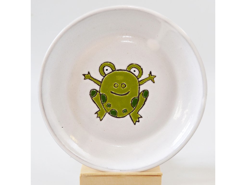 Každý náš talířek je trošičku originál, protože se jedná o ruční výrobek. Než si na něj postavíte svůj oblíbený hrnek nebo na něj své návštěvě nabídnete dezert, vezme jej do rukou mnoho lidí. Nejprve jej nalijeme do formy a necháme ho zaschnout tak, aby měl požadovanou šířku. Pak jej opatrně vyjmeme a obrousíme nedokonalosti. Po uschnutí čeká talířek první výpal v keramické peci a poté přijde řada na glazuru a dekor. Obrázky na talířky si buď předmalováváme voskem (to jsou ty obrázky s viditelnou konturou) nebo je malujeme barvítky přímo na glazuru (drobné vzorky kytiček nebo puntíků). A teprve potom ho čeká ostrý výpal v keramické peci.