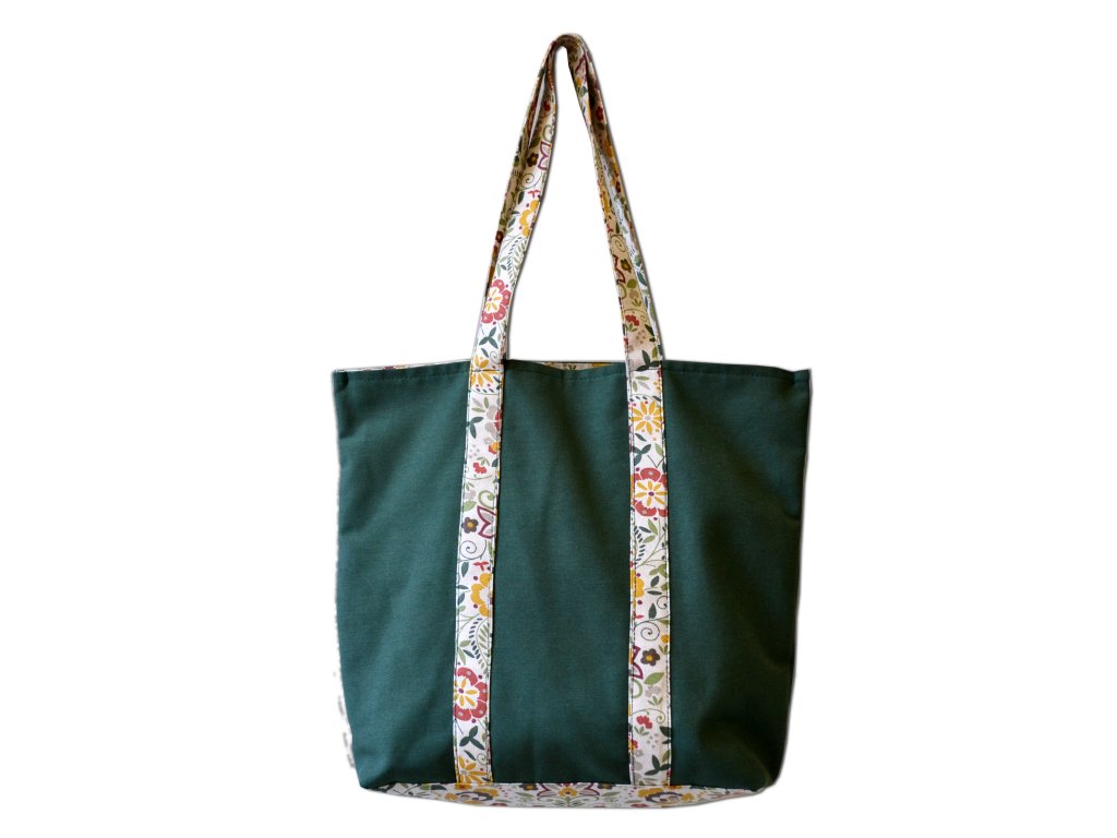 Taška je ušita ze silnějšího plátna zelené barvy a je doplněna uchy, podšívkou a dnem z kontrastní látky s květinovým vzorem.