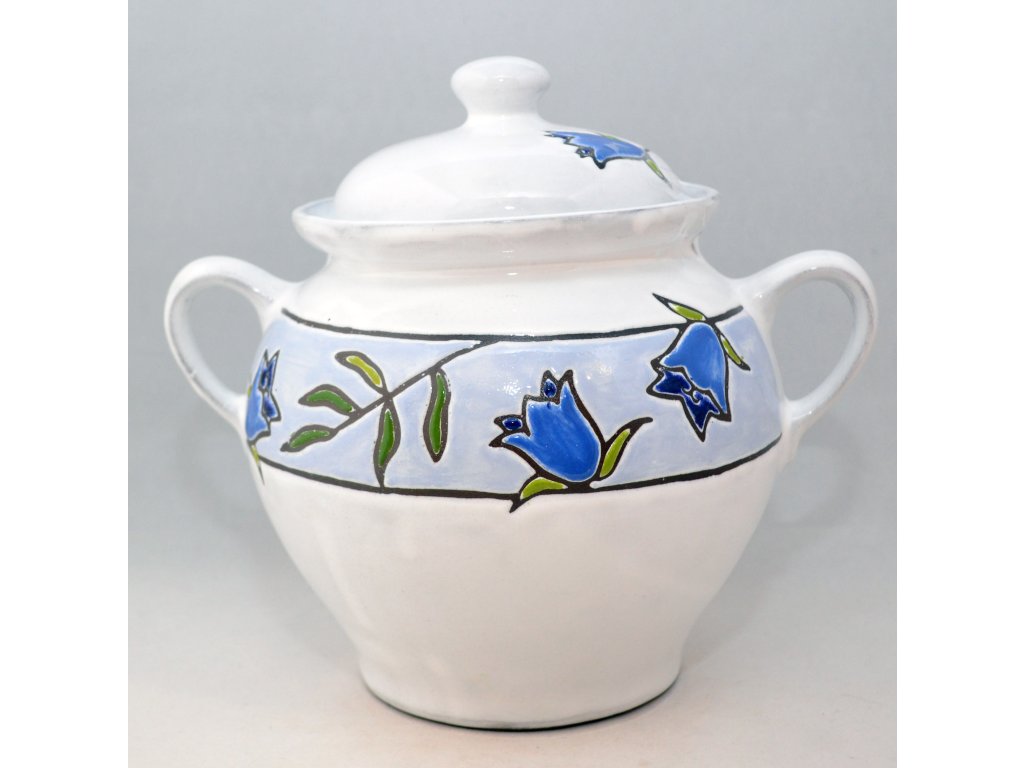 Každá naše zásobnice je trošičku originál, protože se jedná o ruční výrobek. Než si do ní cokoliv nalijete, nasypete, vezme ji do rukou mnoho lidí. Nejprve ji nalijeme do formy a necháme ji zaschnout tak, aby její stěny měly požadovanou šířku. Pak ji opatrně vyjmeme a obrousíme nedokonalosti. Po uschnutí čeká misku první výpal v keramické peci a poté přijde řada na glazuru a dekor. Obrázky na misku si buď předmalováváme voskem (to jsou ty obrázky s viditelnou konturou) nebo je malujeme barvítky přímo na glazuru (drobné vzorky kytiček nebo puntíků). A teprve potom ji čeká ostrý výpal v keramické peci.